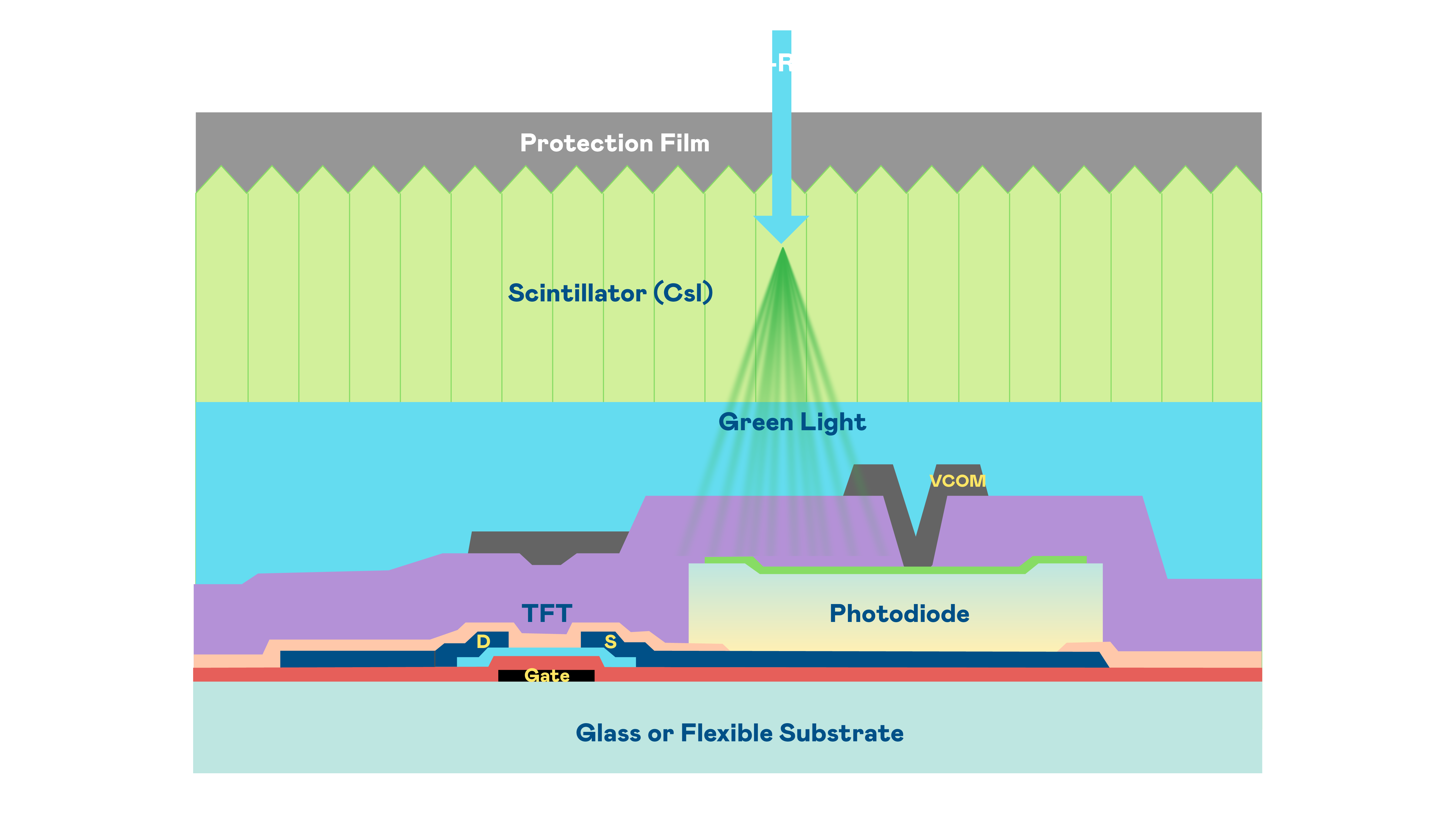 PA视讯的X光影像感测阵列使用薄膜电晶体 (TFT) 作为每个像素的读取开关,搭配光电二极体(Photodiode)的光电转换元件,用以感测X光影像讯号。